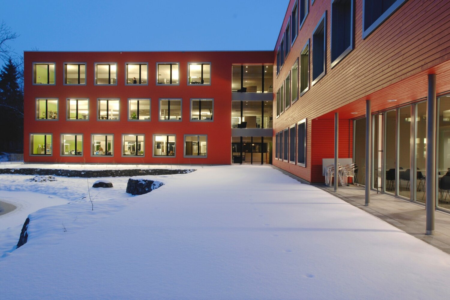 Der L-förmige Baukörper der Vogelwarte umschliesst einen naturnah gestalteten, ruhigen Aussenraum, der fliessend in den Ufersaum des Baches übergeht. Auf der Seite der Kantonsstrasse bildet ein in den Baukörper eingeschobener zweigeschossiger Riegel mit Bibliothek und Spedition zusätzlichen Schutz vor Immissionen.